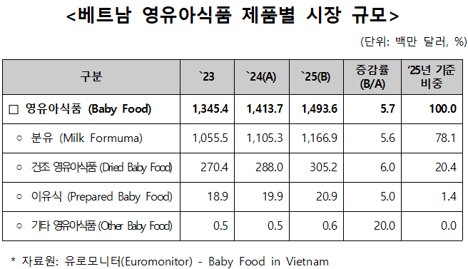 - 유로모니터(Euromonitor)의 영유아식품 보고서에 따르면 `23년~`24년의 경기 침체 기간 이후 베트남의 영유아식품 시장은 `25년 초부터 회복 조짐을 보이고 있으며, 이러한 경기 회복은 제품 소비에도 긍정적인 영향을 미쳐, `25년에는 `24년 대비 약 5.7%의 성장을 기록하여 약 14억 9,400만 달러를 기록할 것으로 전망되었음