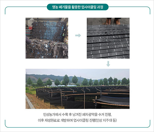 KGC인삼공사는 인삼 농가에서 발생하는 영농폐기물 문제 해결을 위해 팔을 걷어붙였다. 인삼 재배에 필수적인 차광막 등은 부피가 크고 처리 비용이 부담스러워 농가에서 이를 불법 소각하거나 산야에 방치하는 경우가 많았다. 공사는 이러한 환경 오염 문제를 해결하고 경작인의 비용 부담을 덜어주기 위해 농가 상생형 자원순환 모델을 기획했다.