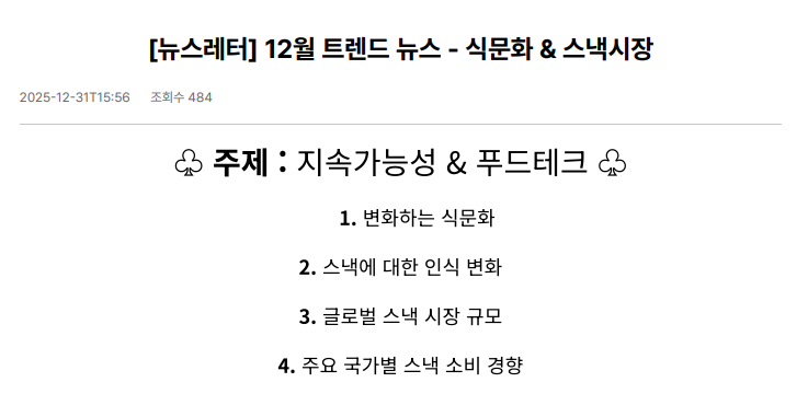제품분석,동향 [뉴스레터] 12월 트렌드 뉴스 - 식문화 & 스낵시장 곡산 2026. 1. 8. 08:28 22512-31 ★TrendNews_`25.12월_식문화&스낵시장_OCR.pdf 3.05MB