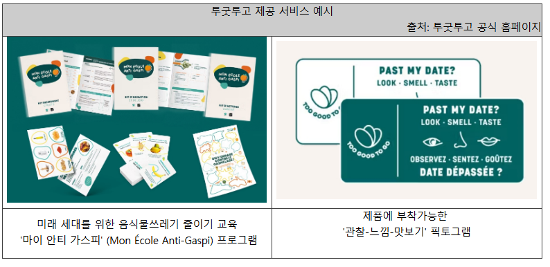 투굿투고(Too Good To Go)는 더 나은 식품 낭비 방지를 위해 혁신적인 시도를 이어가고 있다. 단순히 폐기 예정 음식을 담은 '서프라이즈 백'을 넘어, 유통업체들이 재고를 효율적으로 관리할 수 있도록 AI 기반의 유통기한 관리 시스템을 개발 및 지원하는 푸드테크의 단계로 성장 중이다. 또한 '마이 안티-가스피 스쿨(Mon École Anti-Gaspi)'과 같은 친환경 교육 프로그램을 통해 미래 세대의 소비 습관을 변화하고, 제품에 '관찰-느낌-맛보기(Observez-Sentez-Goûtez)'라는 픽토그램을 제작 및 부착하여 유통기한이 지난 제품을 다시 한번 살펴보도록 하는 등 전반적인 식품 소비 인식을 개선하고 있다.