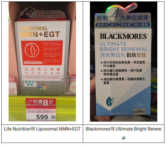 또 다른 인기 성분인 글루타치온(Glutathione)은 항산화 작용과 함께 피부 톤 관리와 관련된 이너뷰티 성분으로 주목받고 있다. 예를 들어 Blackmores 등 글로벌 브랜드는 글루타치온, 비타민 C 등 항산화 성분을 조합한 캡슐 제품을 통해 피부 톤·광채 개선과 자외선으로 인한 산화 스트레스 완화를 돕는 이너뷰티 솔루션을 제안하며 잡티·칙칙함 개선에 관심이 큰 홍콩 소비자들 사이에서 인지도를 넓혀가고 있다.