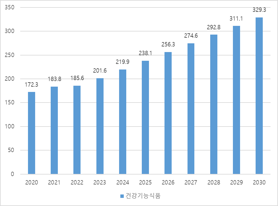 홍콩 건강기능식품 시장은 최근 몇 년간 꾸준히 성장해왔으며, 앞으로도 지속적인 상승세가 이어질 것으로 기대된다. Statista에 따르면, 홍콩 건강기능식품 시장 매출은 2020년 약 1억 7230만 달러에서 2022년 약 1억8560만 달러로 연평균 3.8%의 완만한 성장률을 기록했다. 이어 2022년부터 2030년까지는 연평균 7.4%의 빠른 성장세를 보이며, 2030년에는 약 3억2930만 달러 규모에 이를 것으로 전망된다.