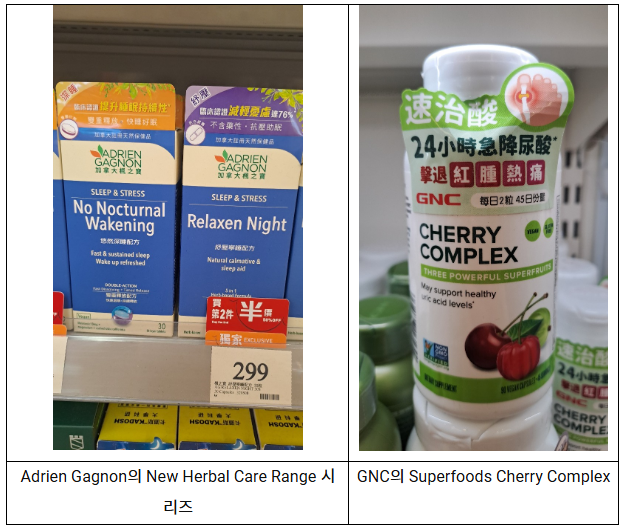 예를 들어, 캐나다 건강기능식품 브랜드 Adrien Gagnon은 홍콩 Mannings를 통해 멜라토닌, 허브 추출물 등을 활용한 수면·스트레스 케어 제품을 선보이며 홍콩 소비자들의 수면 습관 개선을 주제로 한 캠페인을 전개하고 있다. 해당 제품들은 식물성 성분과 기능성 성분을 조합해 수면의 질 개선과 긴장·스트레스 완화에 도움을 주는 것을 목표로 한다.