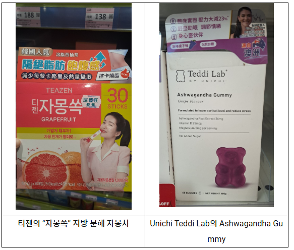 구미 캔디도 건강기능식품의 인기 있는 제형으로 자리 잡고 있다. Unichi Teddi Lab의 Ashwagandha Gummy는 아슈와간다 추출물과 일부 비타민·미네랄을 함유한 곰 모양 구미로, 스트레스 관리와 수면의 질 개선에 관심 있는 소비자를 겨냥한 제품이다. 달콤한 포도 맛과 간식 같은 식감 덕분에 알약에 부담을 느끼는 홍콩 소비자들이 일상 속에서 가볍게 섭취할 수 있는 스트레스 케어 옵션으로 활용되고 있다.