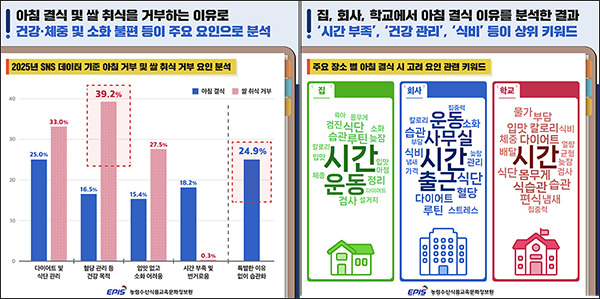 2025년 기준 SNS 데이터를 분석한 결과 ‘아침 결식 및 쌀 취식 거부 요인’은 건강·체중 관리, 소화 불편이었으며 뚜렷한 이유 없이 아침 식사를 거르는 습관이 형성됐다는 의견도 상당 비중을 차지했다.