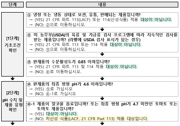 산성식품 또는 산성화식품(21 CFR Part 114) 해당 여부를 별도로 판단해야 합니다.