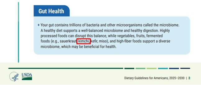 이번 발표에서 눈에 띄는 점은 발효음식 섭취 권고가 가이드라인에 직접적으로 포함됐다는 점이다. 미 정부는 새로운 가이드라인에서 장 건강의 중요성을 강조하며, 장 건강과 연관성이 높은 장내 유익균 증진을 위해 채소와 과일, 발효음식, 섬유질 함유량이 높은 식품의 섭취를 권고했다. 이 가운데 김치를 구체적인 발효음식의 사례로 명시했다.