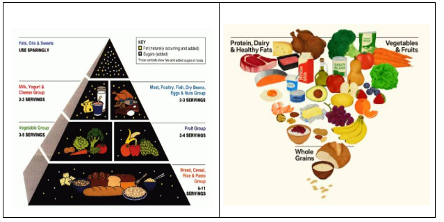 <1992년 공개된 기존 식품 피라미드(좌)와 새롭게 변경된 식품 피라미드(우)>