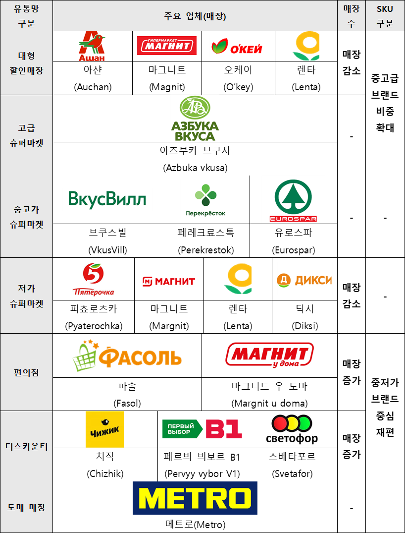 최근 러시아 소매업계는 SKU 수를 줄이고 회전율이 높은 상품 위주로 매장을 구성하며, 다품종 중심 모델에서 벗어나고 있는 것으로 나타남.